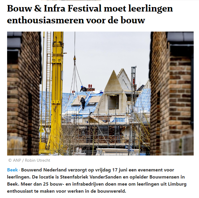 Beek - Bouwend Nederland verzorgt op vrijdag 17 juni een evenement voor leerlingen. De locatie is Steenfabriek VanderSanden en opleider Bouwmensen in Beek. Meer dan 25 bouw- en infrabedrijven doen mee om leerlingen uit Limburg enthousiast te maken voor werken in de bouwwereld.