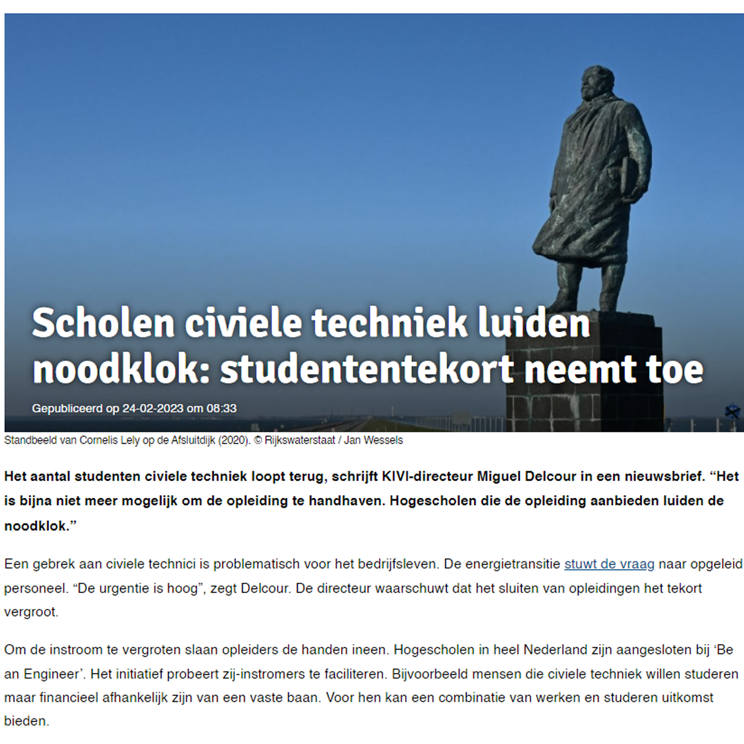 Het aantal studenten civiele techniek loopt terug, schrijft KIVI-directeur Miguel Delcour in een nieuwsbrief. “Het is bijna niet meer mogelijk om de opleiding te handhaven. Hogescholen die de opleiding aanbieden luiden de noodklok.”